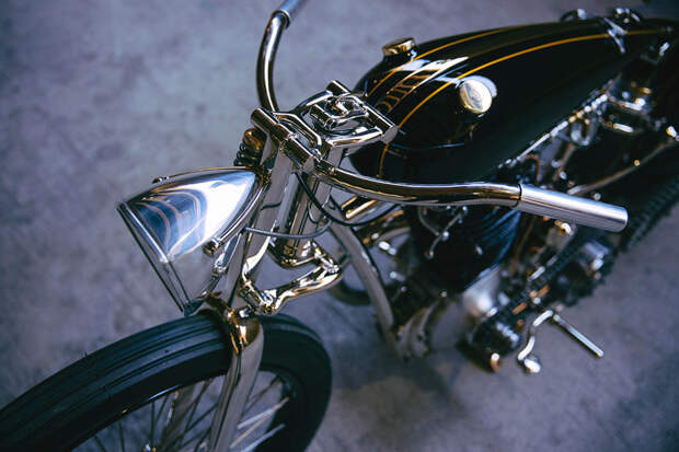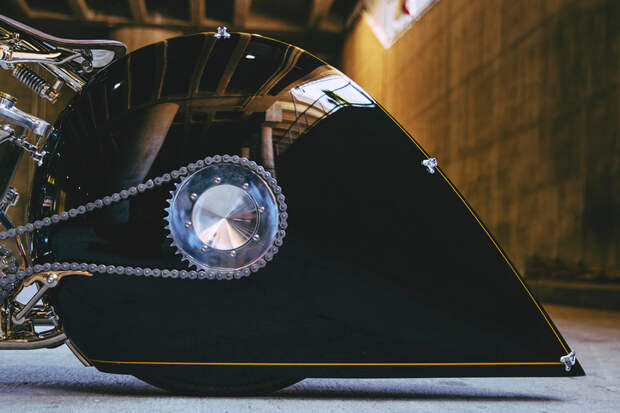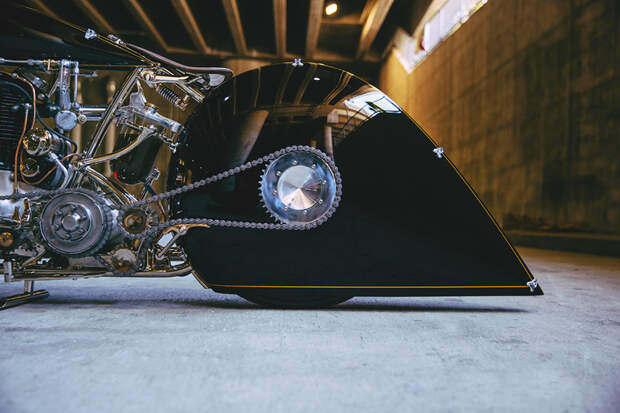 Финальный привод тоже необычный. "Я знал, что мотоциклу будет нужен некоторый тип промежуточного вала в одну линию с вынесенной задней звездочкой," говорит Макс ", но я ненавижу так, как они обычно смотрятся. Я сделал все возможное, чтобы придумать с такой установкой, которая работала бы хорошо, но не была похожа на беспорядок и имела бы интегрированный натяжитель цепи."