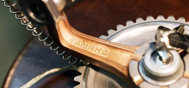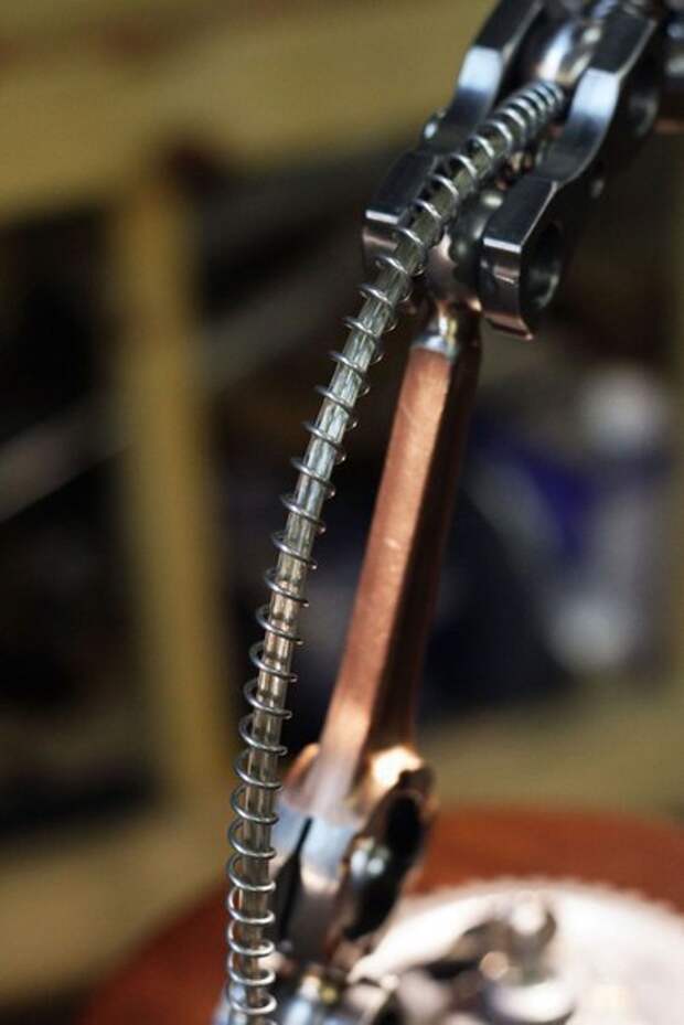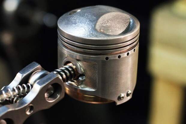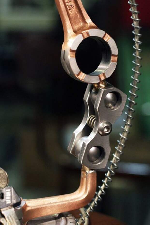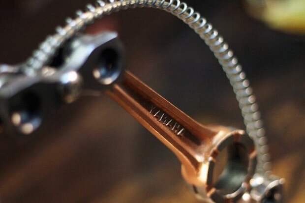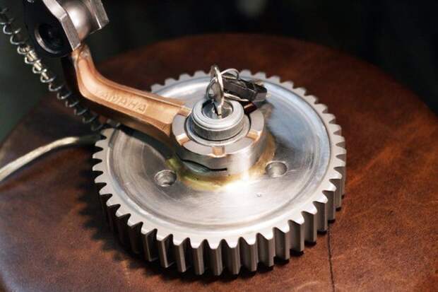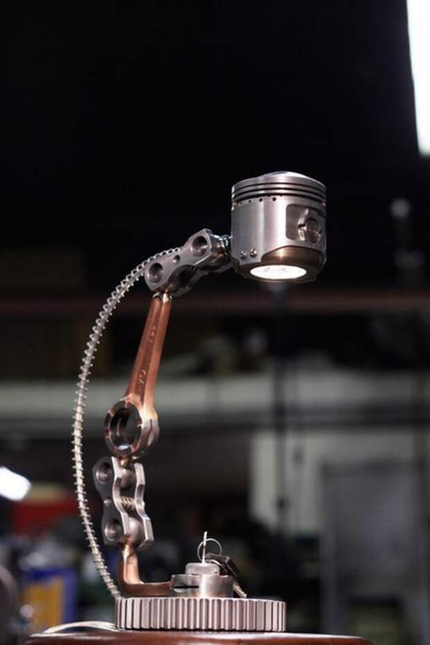 По заказу друга, который хотел что-то уникальное для его отца, он создал этот светильник: поршень Yamaha XS650 как база, с двумя XS650 шатуны на рукаве, большой шестерни для основания и переключатель зажигания в качестве включения / выключения механизма.