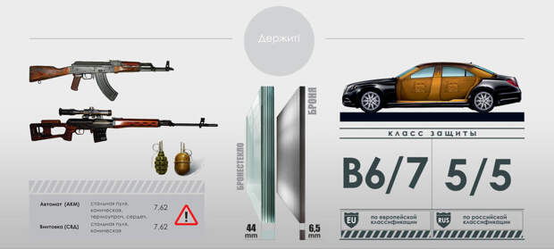Как потом выяснилось, пострадавший S 500, в отличие от «Мерседеса» Эдуарда Шеварднадзе, был бронирован не в Германии, фирменным подразделении Guard, а в России, частной компанией RIDA. Скептики назвали такую защиту кустарной, спасение Евкурова — чудом. Представители компании парировали — мол, главное, VIP-пассажир выжил, да и автомобиль прошел сертификацию на устойчивость к обстрелу и подрыву по российскому классу 5. Это значит, броня и стекла готовы были принять 7,62-мм бронебойно-зажигательную пулю АКМ или стальную пулю снайперской винтовки СВД, спасти при взрыве гранат Ф1 и РГД-5. По факту выдержали больше — 70 кг в тротиловом эквиваленте.